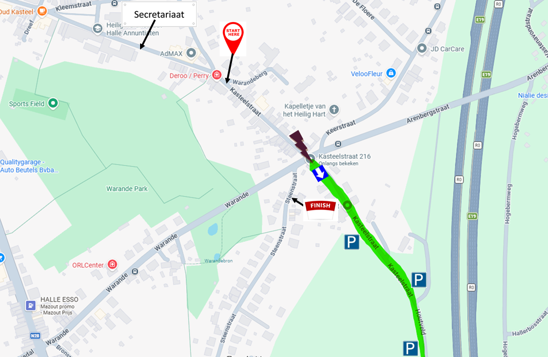 De start bevindt zich op 200m van het kruispunt Warande/Arenbergstraat (zie zwarte bliksem). Het secretariaat bevindt zich lager in de Kasteelstraat op ongeveer 150m van de start.