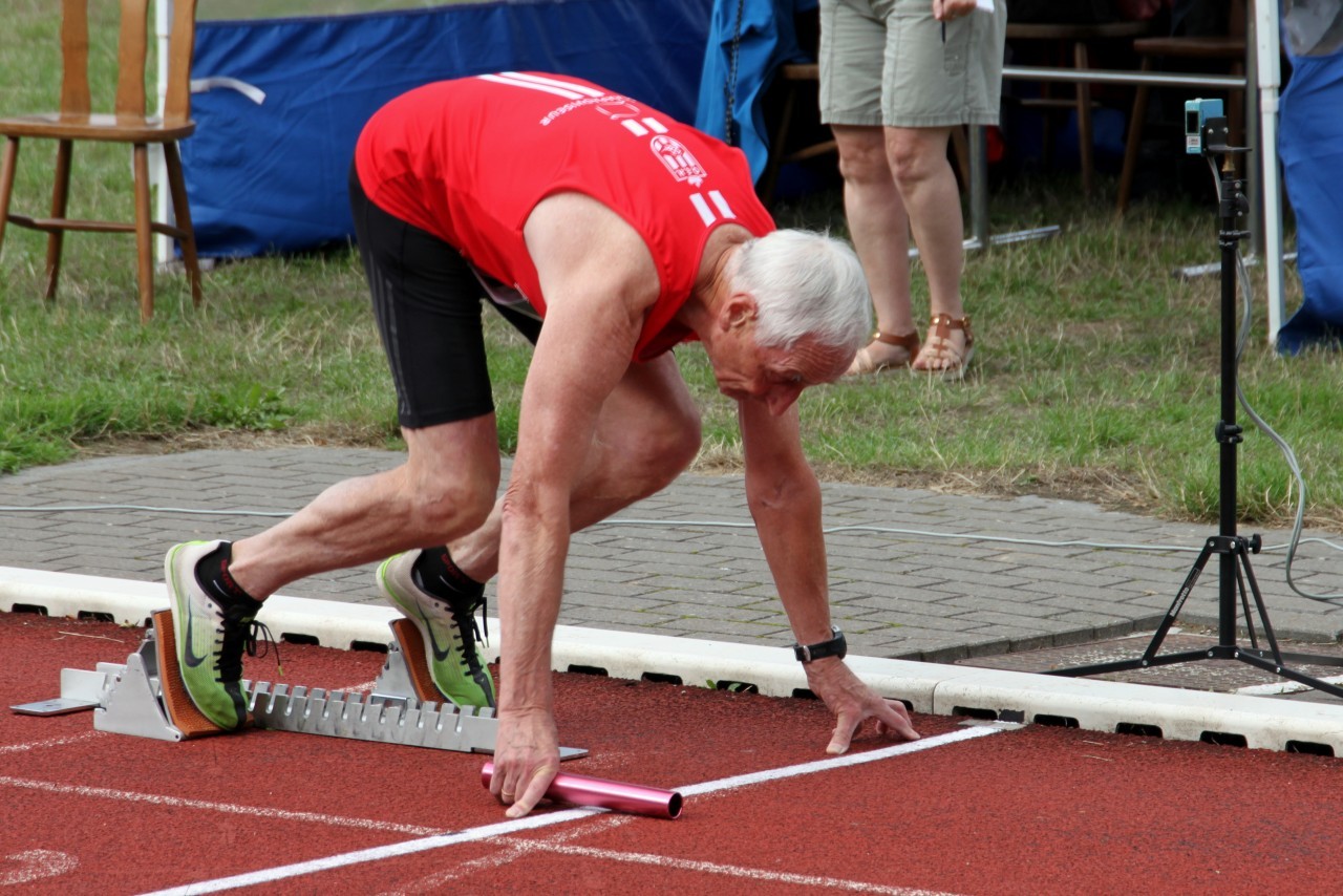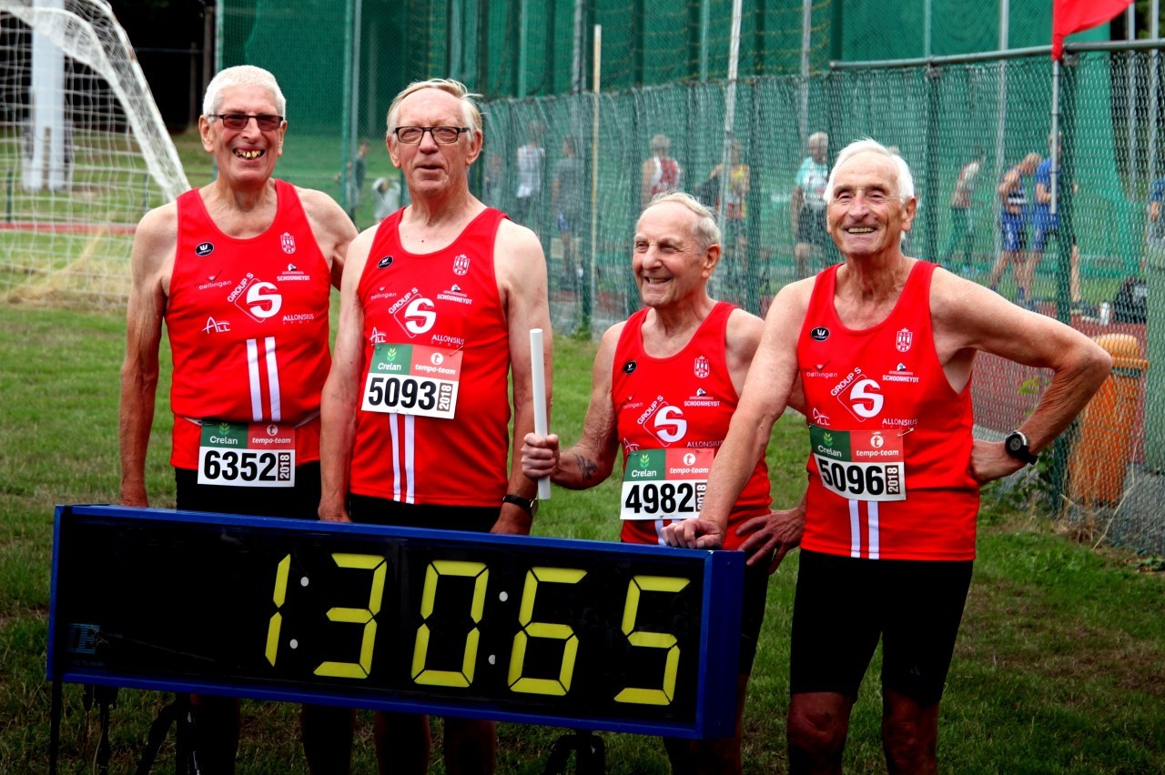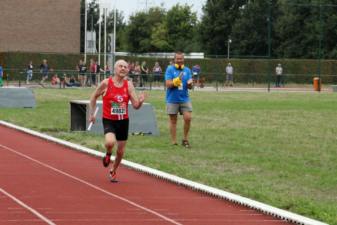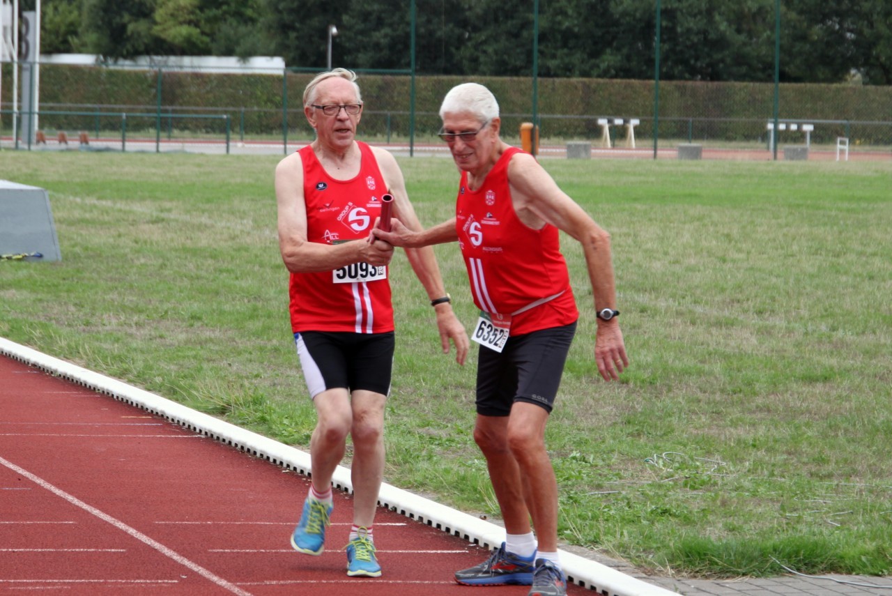 Gisteren, 18 augustus 2018, werden er op de piste in Zwevegem aflossingswedstrijden georganiseerd. Eerst stond de 4x100m op het programma. Hier kwam onze mastersploeg M80 aan de start. Startloper Henri Lenoir (86) liep een snelle 100m om de stok door te geven aan de jongste van de ploeg Jean Basteleus (80). De volgende loper, François Boonen (82) nam de 2e bocht voor zijn rekening en slotloper Jean-Pierre Van Impe (81) haalde nog alles uit de kast om op een eindtijd van 1’28’’98 uit te komen.